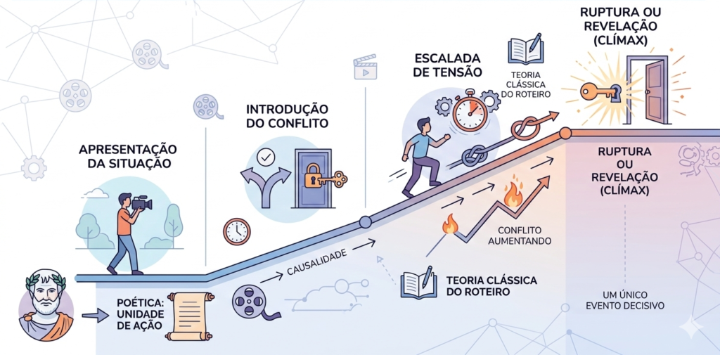 De acordo com a ideia de unidade de ação, apresentada na Poética. Aristóteles defendia que uma narrativa forte se organiza em torno de um único acontecimento central, com começo, meio e fim articulados por causalidade. No campo do roteiro contemporâneo, autores como Syd Field (Manual do Roteiro) e Robert McKee (Story) reforçam essa ideia de progressão dramática: o conflito deve aumentar até atingir um ponto de virada ou clímax.
